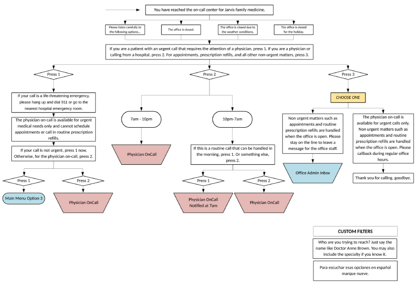Here’s an example of a voicemail tree and custom routing built for an orthopedic practice:
