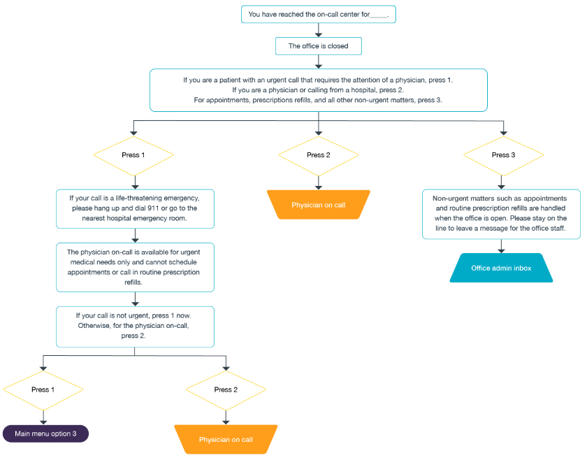 In the basic example, you could change the “urgent call that requires attention” to Press 3, and “for appointments, prescription refills, and all other non-urgent matters,” to Press 1. This provides an initial layer of filtering for most small practices.