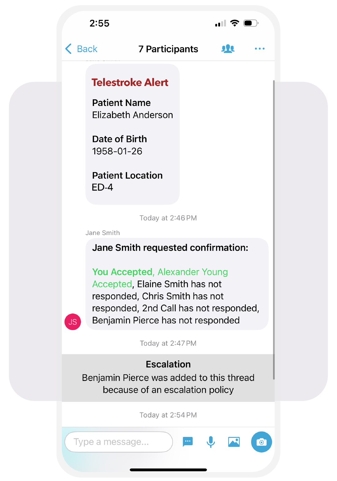 The alert functions like an advanced group message, instantly looping in both the transfer center team and the on-call telestroke physician. PerfectServe automatically references a real-time schedule to pull the right physician into the conversation, and predetermined escalation rules ensure that messages are forwarded to someone who can take action if they go unanswered for a set amount of time. All parties can see replies and even granular details like when messages are read, which makes it easier for everyone to stay current on status.