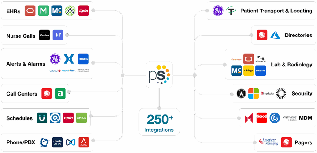 You need alerting from nurse call and telemetry, you still have pager networks in pockets, you use enterprise phones, and you are not the only hospital in town. PerfectServe’s integration catalog reads like a cross-section of that universe.
